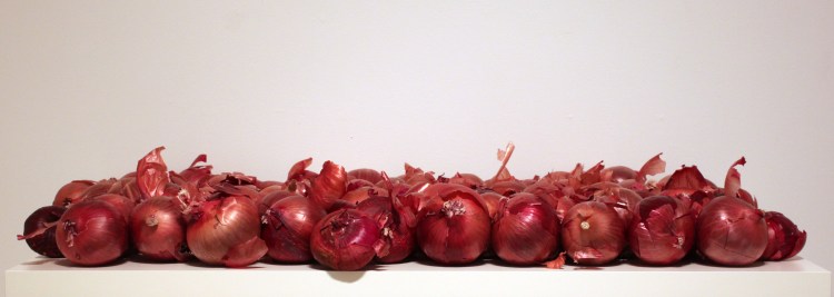 In this art installation, a table of onions lay waiting, their skins moving from the air of a hidden fan. The sound of rushing water quietly accompanies. Titled Threshold, the onion becomes a perfect metaphor for the soul of the world weeping through us, as many of us have experienced the tears that burn our eyes and fall down our cheeks when we cut into an onion. This piece was inspired by a haiku I wrote:
