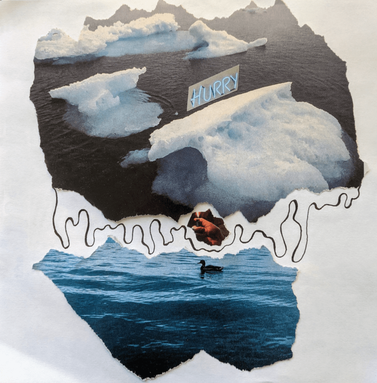 I have spent the last 20 years in higher education teaching art, sustainability, and creative activism. In working with undergraduate students, my interests lie at the intersections of sustainability and mental health, looking specifically at eco-anxiety and eco-grief, and how the arts can serve the healing of personal and collective trauma. My years of facilitation and teaching experience in the realm of higher-education, along side an artist’s sensitivity and depth of insight, come to bear in my work with groups. The image to the right is a student collage about the melting polar ice caps, from my course ‘Art as Therapeutic Process.’